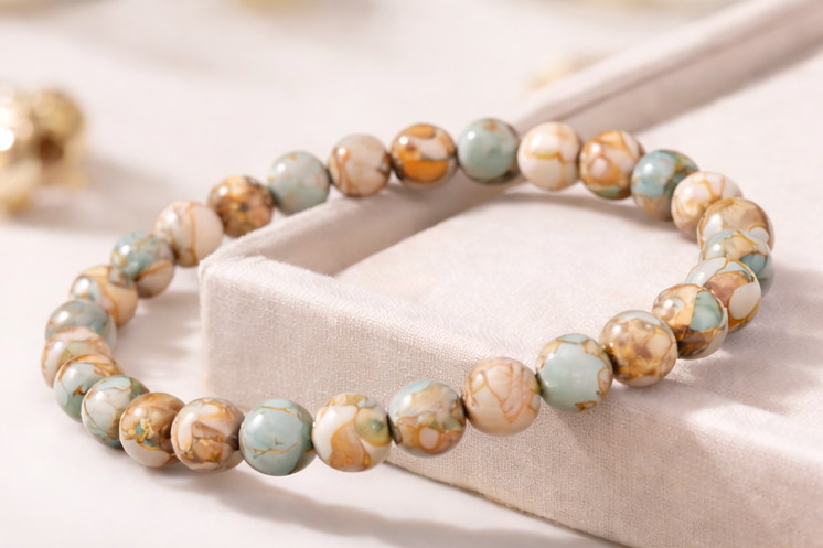 Crafted with genuine Aqua Terra Jasper from China, this bracelet features beautiful ocean-like patterns blended with earthy tones. Each bead carries a unique natural design, making every piece one of a kind.
